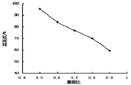 在酸液和反應(yīng)溫度和時(shí)間不變的情況下改變酸粉比例,研究酸粉比與鋁酸鈣粉溶出鋁的關(guān)系。如圖2。