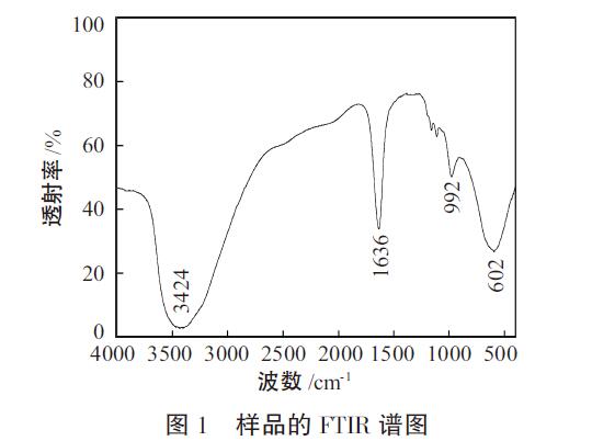 從圖1可以看出,3424cm-1是樣品中與鋁離子相連的-OH基團及樣品內(nèi)所吸附的水分子和配位分子中的-OH基團伸縮振動產(chǎn)生的。吸收峰面積較大,表明樣品中羥基含量較高。1636cm-1是由結(jié)合水(H-O-H)的彎曲振動引起的吸收峰。992cm-1左右的吸收峰是由Fe-OH-Fe,Al-OH-Al的面內(nèi)伸縮振動峰。602cm-1附近的峰是Al-OH-Al的整體彎曲振動峰。