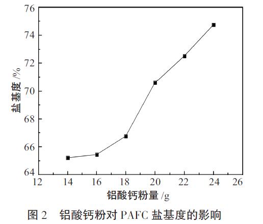 為了考察堿基度對合成聚合氯化鋁鐵絮凝劑的影響,固定12g煤泥灰的酸浸液,其他條件不變,分別添加14、16、18、20、22、24g鋁酸鈣,在聚合溫度為90℃下聚合反應(yīng)3h,熟化后,測定樣品的堿基度。圖2為鋁酸鈣粉對PAFC鹽基度的影響