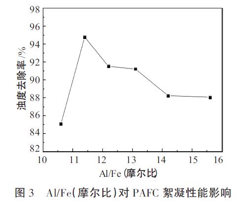 圖3為Al/Fe(摩爾比)對PAFC絮凝性能影響。